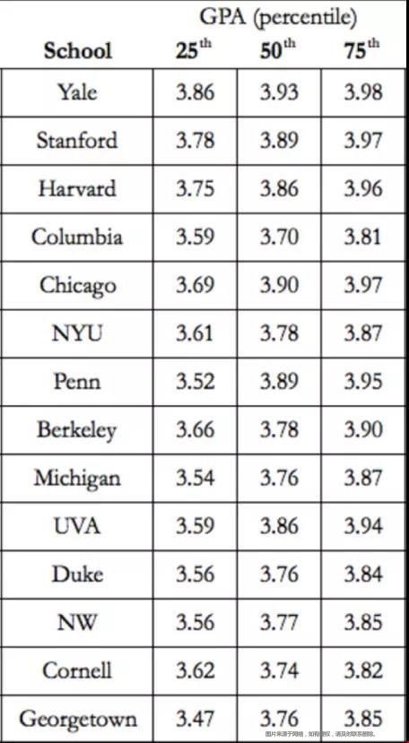 LSAC評(píng)估后的成績(jī)沒有對(duì)應(yīng)具體的GPA,但是各校還是總結(jié)了各自錄取學(xué)生的大概GPA范疇,請(qǐng)參看來(lái)自LSAC的數(shù)據(jù)統(tǒng)計(jì):