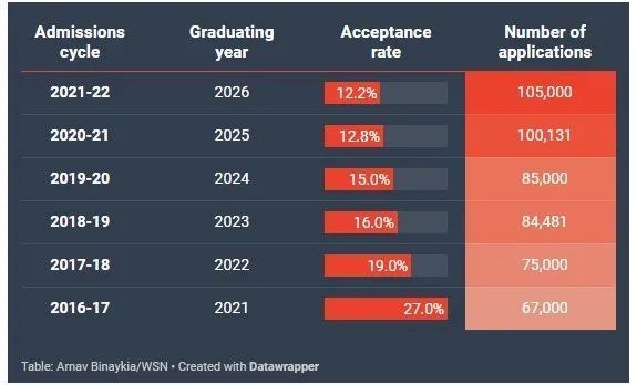 22Fall獲105,000份申請(19,000份ED申請,比去年增加12%),總錄取人數12,810,錄取率12.2%,有三所本科學院錄取率跌破10%!