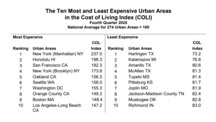 美國社區和經濟研究委員會(Council for Community and Economic Research)根據普通消費品和服務的平均成本計算出了生活成本指數(cost of living index)。生活成本指數 100 分為全國平均水平,小于 100 的數字表示生活成本相對較低,而大于 100 的則相反。